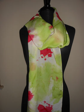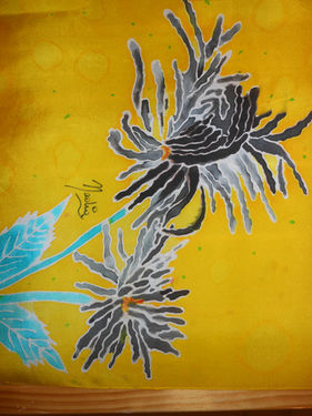 All of my pieces are hand painted in silk. Dresses, Ponchos, scarves. They are all washable as well.